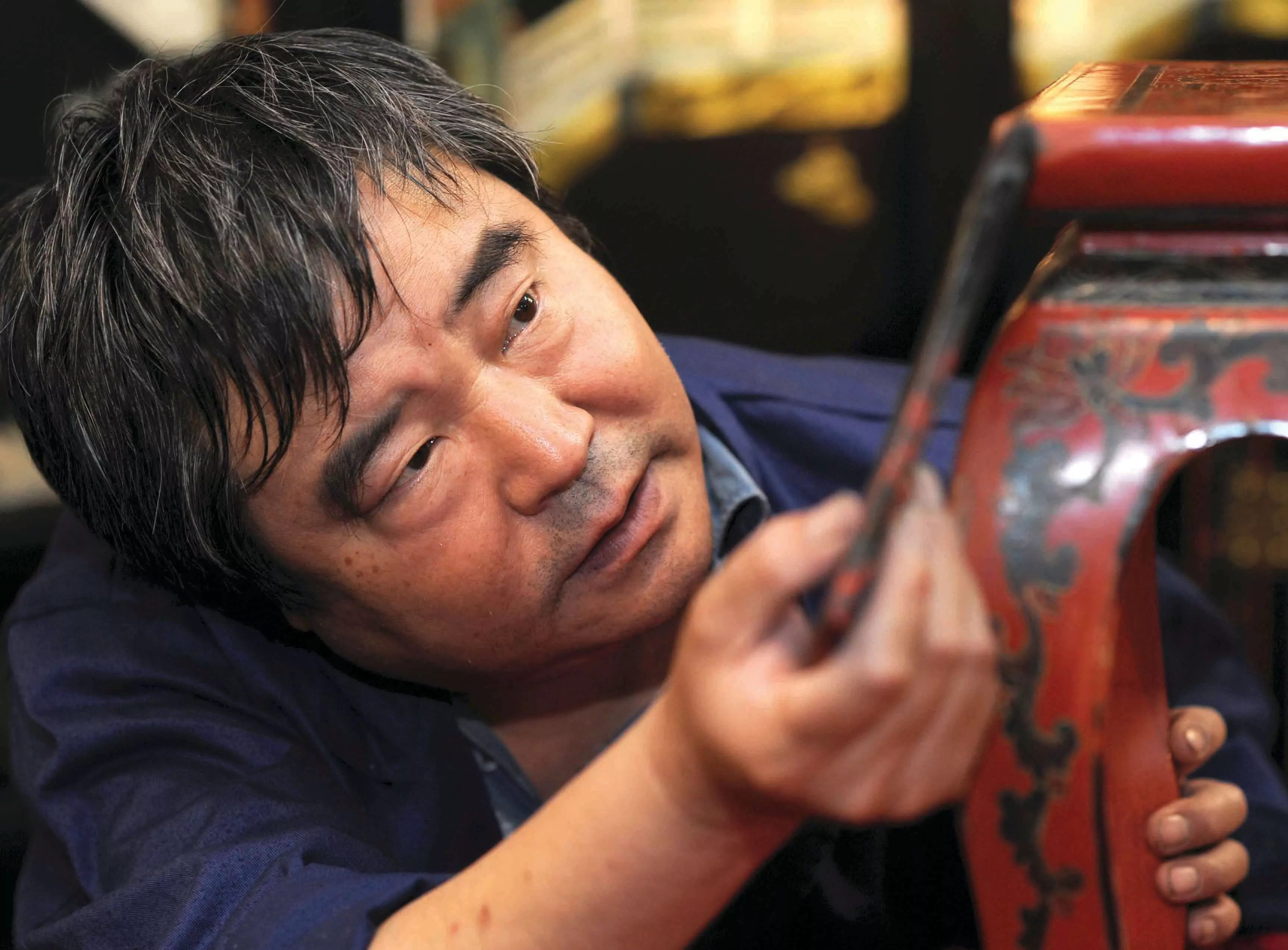 该作品折屏样式,木胎髹黑、红漆地儿,采用金漆镶嵌“堆古贴金、颤断”等工艺制作而成。断纹工艺是金漆镶嵌的秘技之一,曾经一度失传,而后在柏德元大师多年的研究下得以恢复。颤断时必须掌握好腕力和推进速度,既要纹路清晰,又不能迸裂,要有聚有散,错落有致,虽是人工所为,却似天然成就,给人以饱经沧桑,自然形成之感。该作品按照乾隆年《五经萃室记》围屏原作复制。在颤断漆胎基础上,采用堆古贴金工艺,呈现《易》、《书》、《诗》、《礼记》、《春秋》五经文字以及山水、树石等内容。在2016“工美杯”北京传统工艺美术大赛评比中荣获金奖。