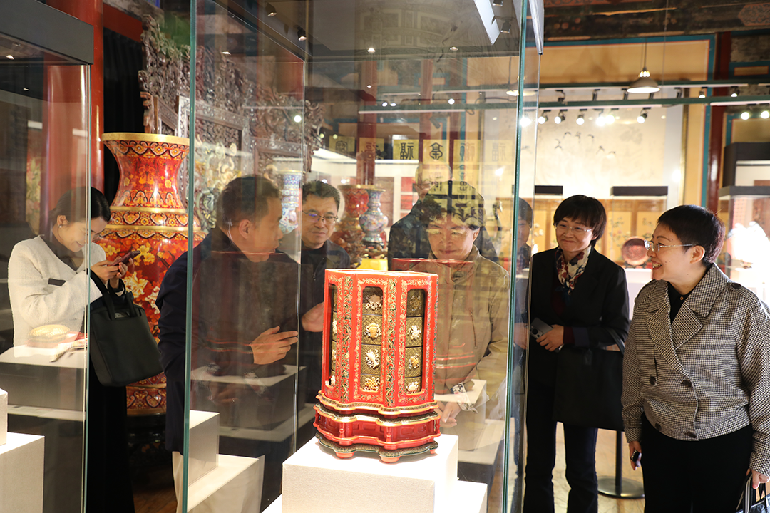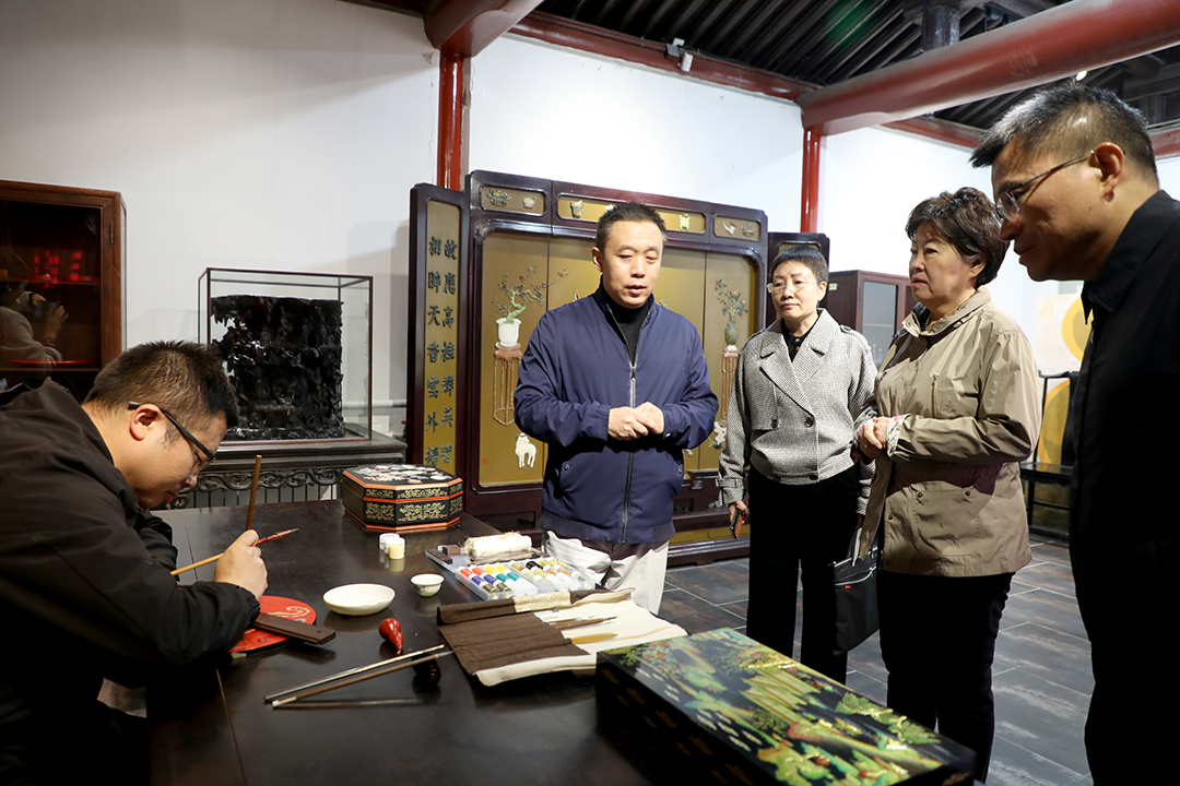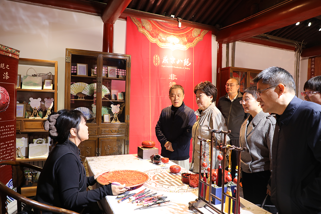 调研组一行还参观了燕京八绝宫廷艺术精品展,观摩金漆镶嵌侯雪大师、雕漆海燕大师技艺展演,近距离品鉴宫廷文化,感受非遗魅力。