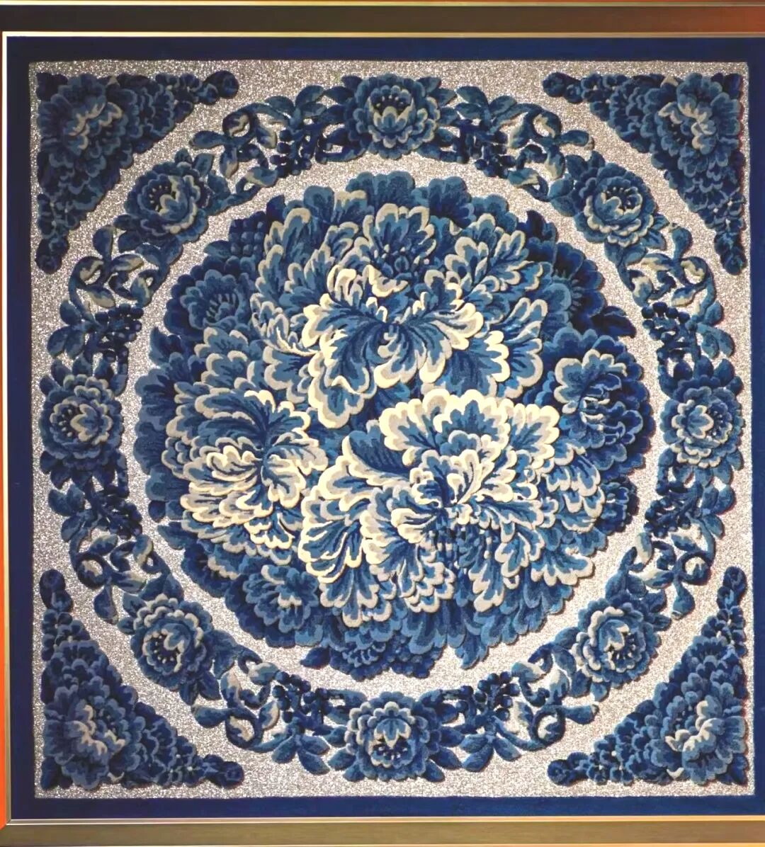 Bathed in cool blues with silver accents, the work depicts moonlit peonies in snow.Regal and resilient, the national flower reflects the artist’s admiration for its noble spirit.A tribute to the nation’s anniversary and the 2022 Winter Olympics.