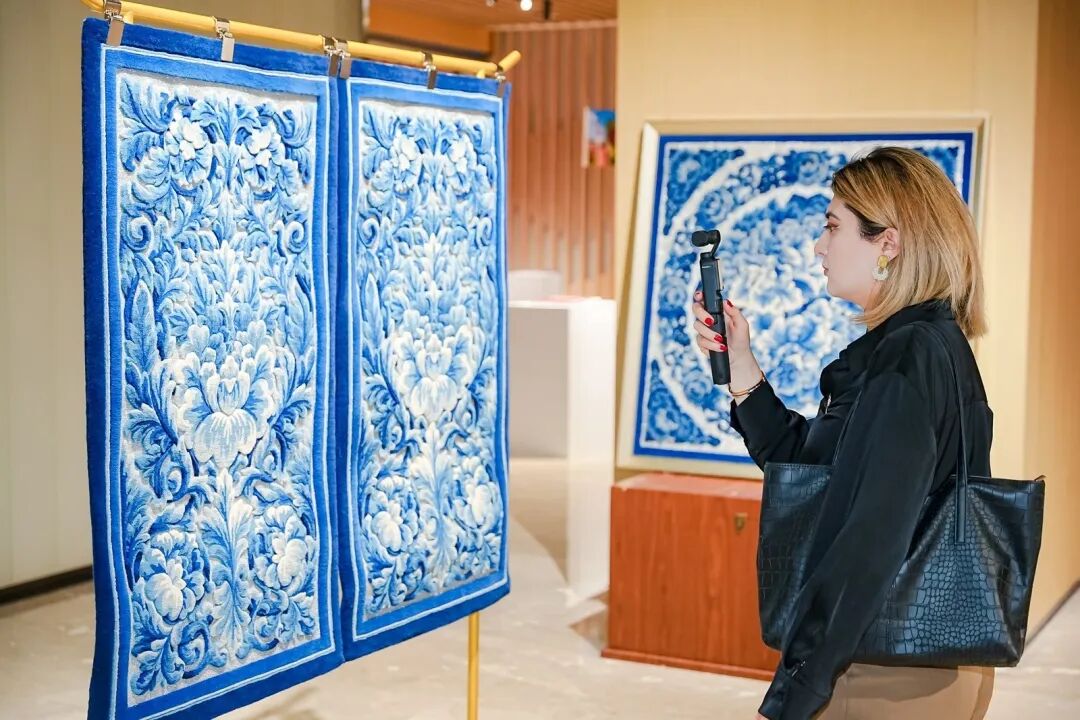 北京塞尔维亚文化中心主任苏达·塔尼亚(Soldat Tatjana)驻足燕京八绝宫毯作品展区