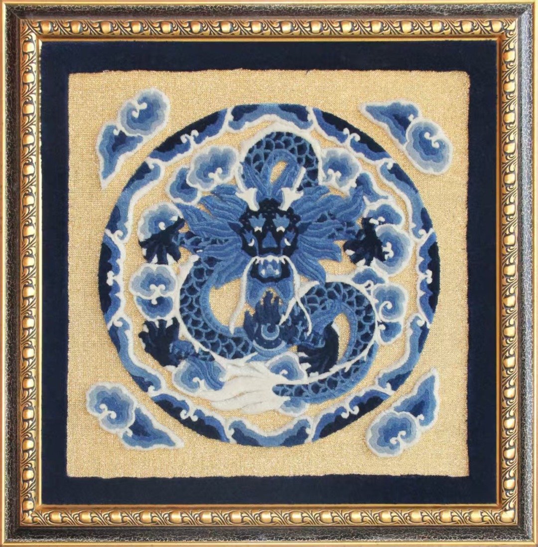 此作品基底为棉,栽绒为羊毛,背景以仿金线织“人”字纹。构图源于乾隆年间苏州织造缂丝龙袍,盘金银工艺华丽繁复,断续纹路更显精巧难织。龙珠含于颔,象征生命诞生、传承与未来期许。