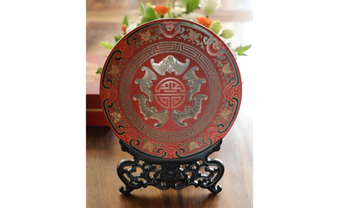 作品以赏盘样式为造型,通体髹饰朱红色漆,采用国家级非物质文化遗产金漆镶嵌髹饰技艺中“雕填、彩绘”工艺制作而成。雕填工艺又称“戗金”,经勾刀刻划流畅线条后填戗金粉及彩漆,这种工艺早在汉代就已出现,传承至明、清时期逐渐走向巅峰,此工艺是金漆镶嵌工艺中的重要门类。作品主题图案五只蝙蝠围绕寿字形成“五福捧寿”纹样,蝙蝠谐音福,是福气的具象化象征,五只蝙蝠分别代表“五福”寿、富、康、德、善,寓意五福齐聚、福运绵长。传递传统祈福文化内涵。正中心团寿纹是长寿的直接符号,体现中国人对生命延续、健康长寿的终极祈愿,与蝙蝠结合,形成“福随寿至、寿以福延”的美好关联。整件作品是文化寓意与装饰功能完美融合的金漆精品,也彰显了金漆镶嵌皇家御用工艺的深厚底蕴。
