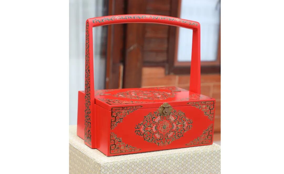 作品以箱盒样式为造型,通体髹饰朱红色漆,采用国家级非物质文化遗产金漆镶嵌髹饰技艺中“雕填、彩绘”工艺制作而成。雕填工艺制作流程复杂,需先制胎髹漆打底,绘制纹样轮廓,用刀雕出发丝槽线,再填色戗金粉勾边,经数次打磨才可形成漆器。此件作品雕填部分图案采用缠枝莲牡丹纹,缠枝莲牡丹纹是中国传统吉祥纹样之一,以牡丹为核心元素,通过藤蔓缠绕形成连续图案,寓意“富贵吉祥”。整件作品既体现了传统工艺的精湛技艺,又承载着吉祥文化内涵,具有较高的实用性和收藏价值。